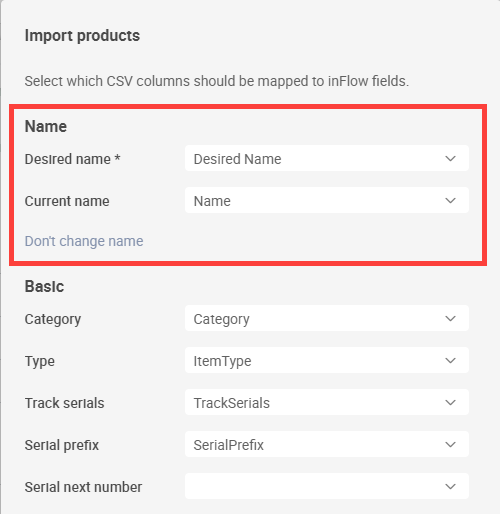 - Match the Desired Name column to the Desired Name field and the column with your current product names to the Current Name field by selecting them from the drop-down lists.