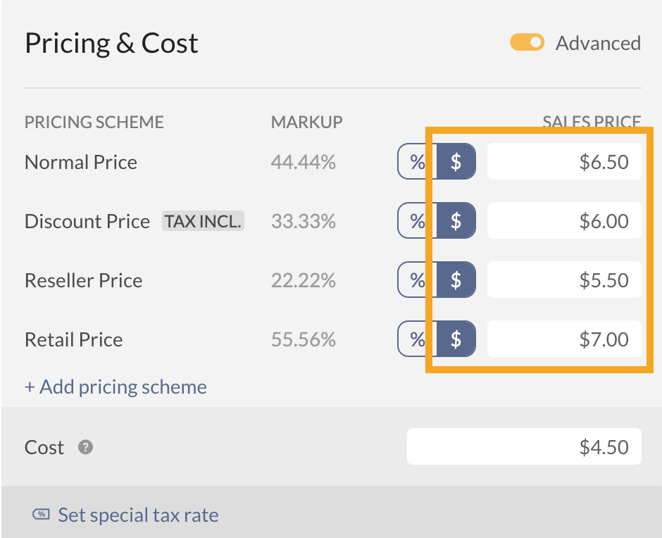 When Advanced is toggled on, all pricing schemes default to the fixed price markup option (the dollar sign symbol is selected.) With this markup option, you enter the price instead of inFlow, which calculates it based on your cost.