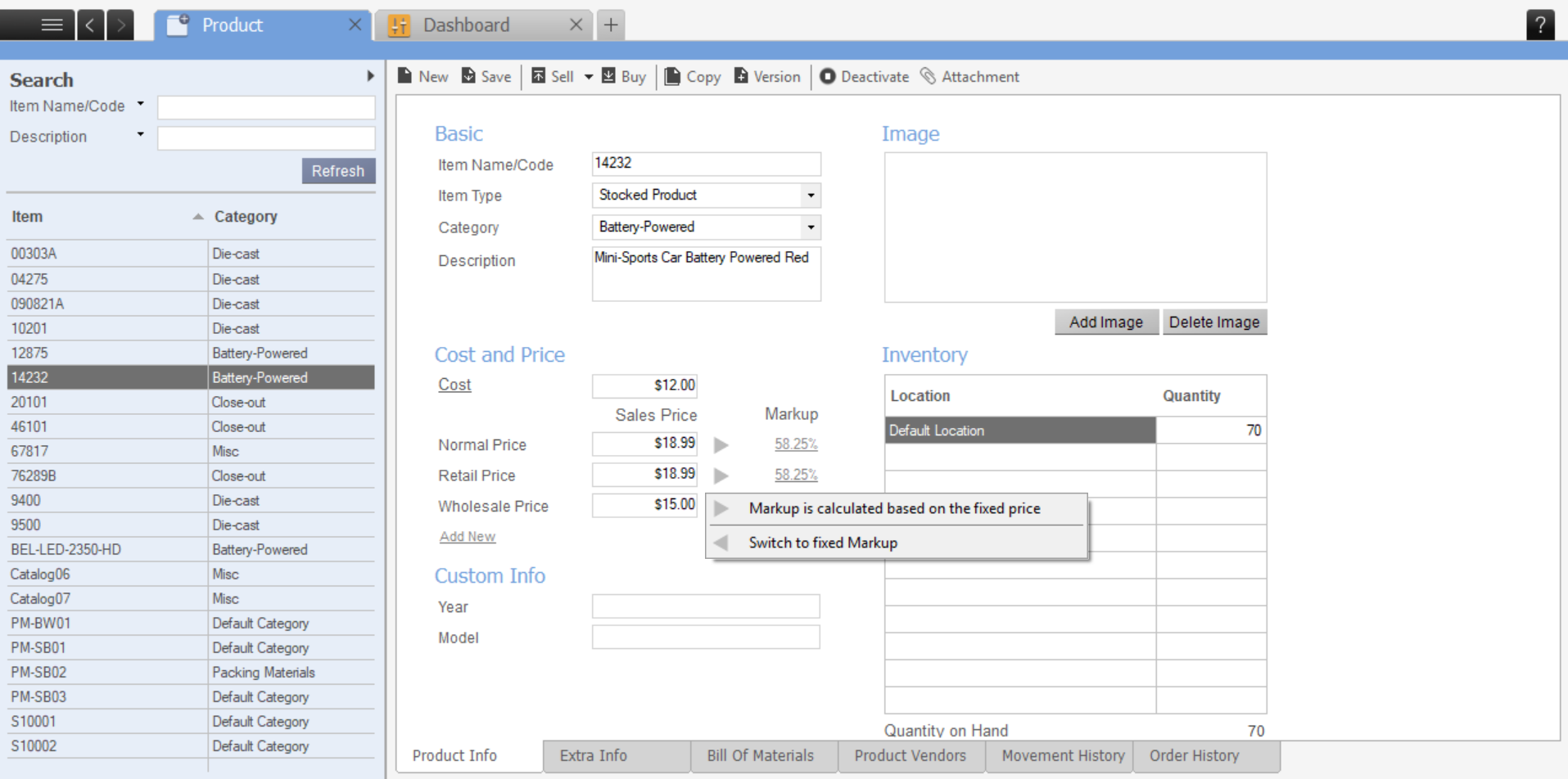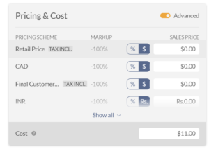 In inFlow, you can set your product’s markup for all of your pricing schemes, and depending on the costing method selected, you can edit the cost, too.