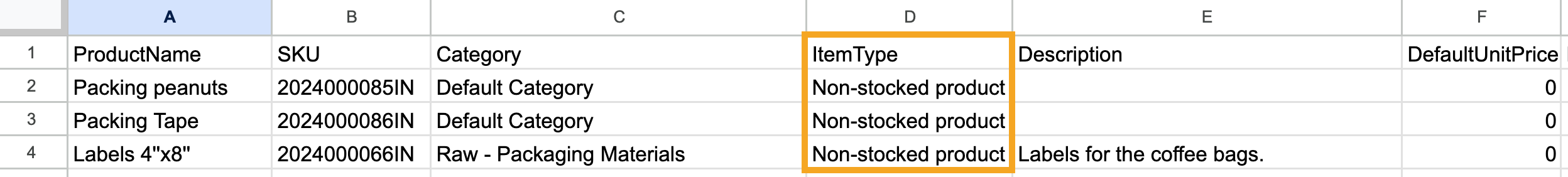 - In the ItemType column, enter the word “Non-stocked product” without quotation marks.