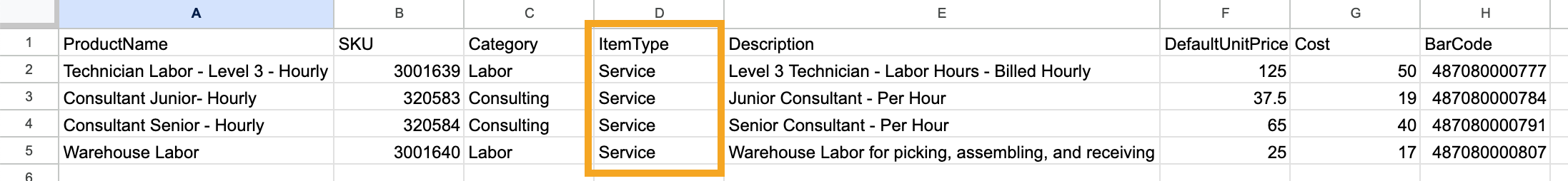 - In the ItemType column, enter the word “Service” without quotation marks.