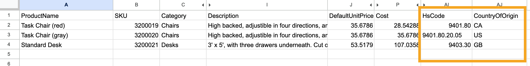 You can import the product Harmonized System codes (HS codes) and the Country of origin by adding the following headings to your CSV file: