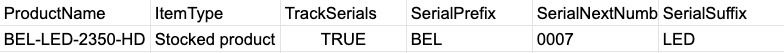 In the following example, inFlow will create a product record named “BEL-LED-2350-HD”, and “BEL0007LED” would be the following serial number generated in inFlow if you were to add more stock to this product.
