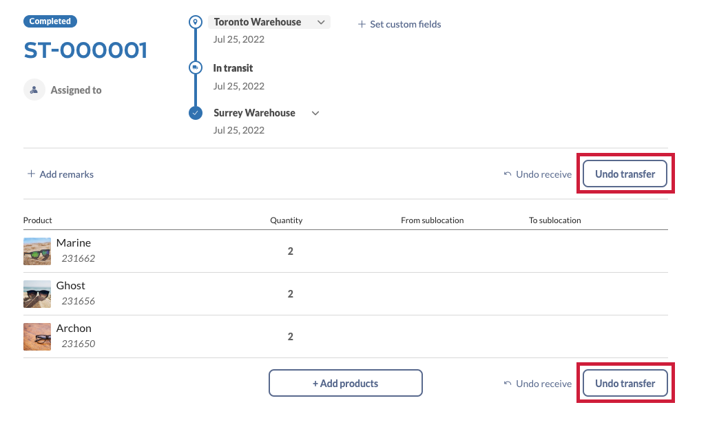 If you sent a stock transfer by mistake, you can undo the transfer to restore your product quantities.