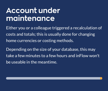 - You'll see an Account under maintenance message. When the calculation is complete you'll be able to log into inFlow again.