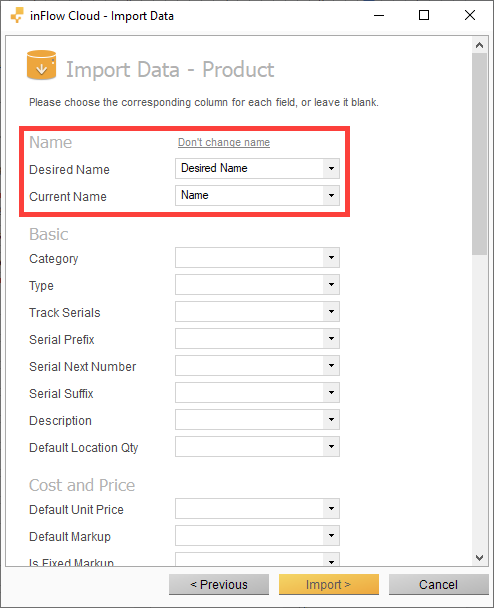 - Match the Desired Name column to the Desired Name field and the column with your current product names to the Current Name field by selecting them from the drop-down lists.