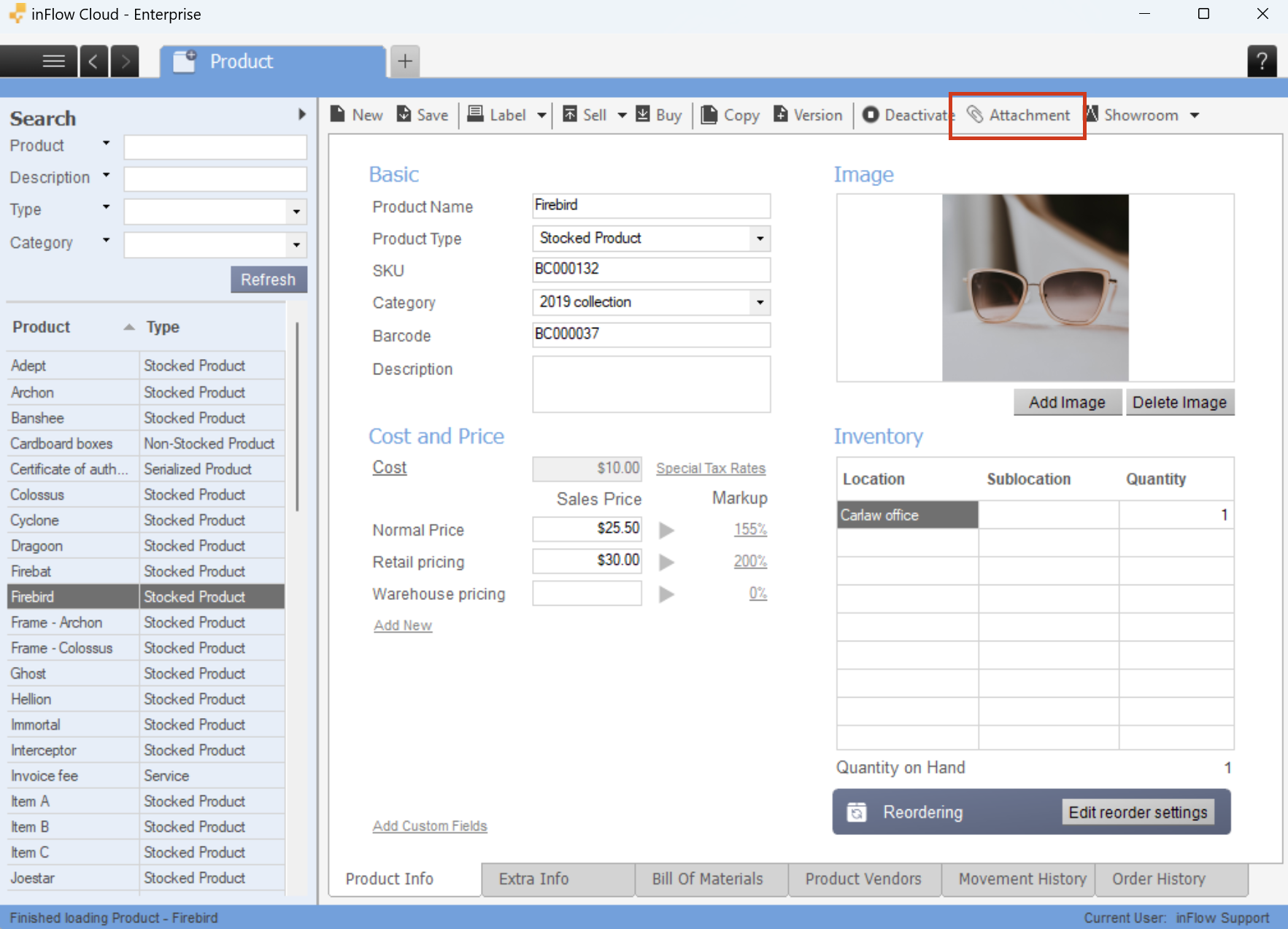 In inFlow, you can attach files to records and orders. For example, you can attach a warranty to an order or certificates and tax breaks to a customer record.