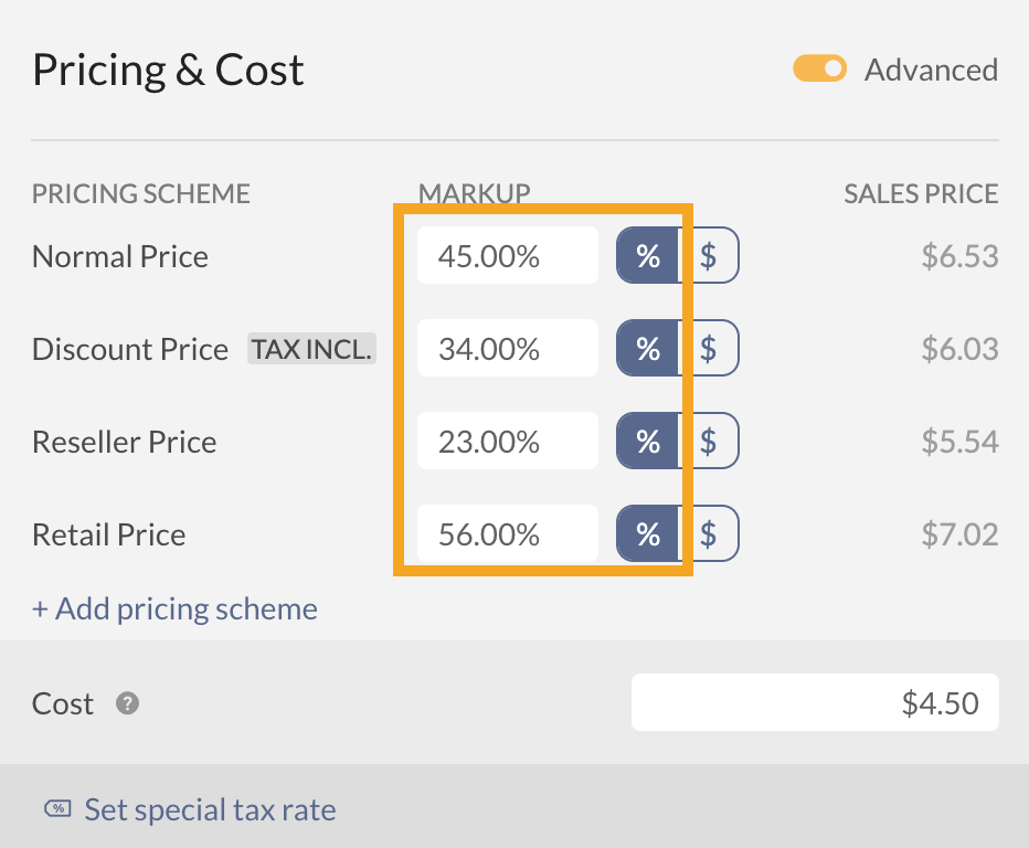 When Advanced is toggled on, all pricing schemes default to the fixed price markup option (the dollar sign symbol is selected.) With this markup option, you enter the price instead of inFlow, which calculates it based on your cost.