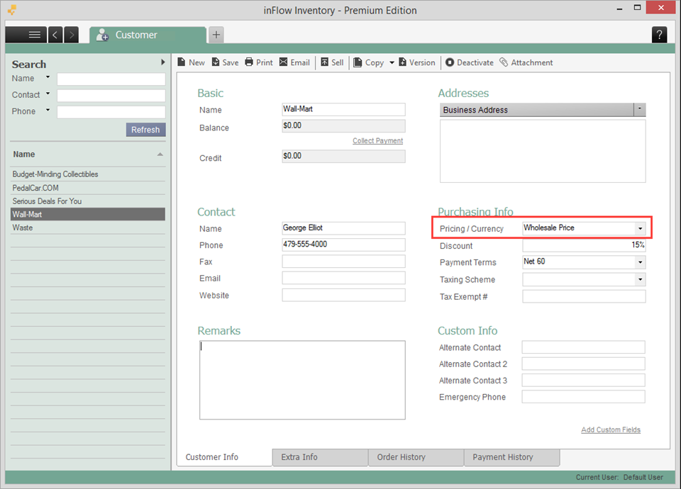 You can also assign customers different pricing schemes so that inFlow uses the Wholesale prices for wholesale customers, retail prices for retail customers, etc.