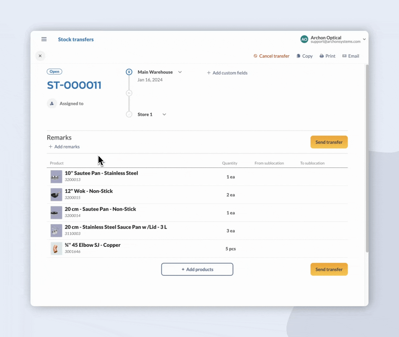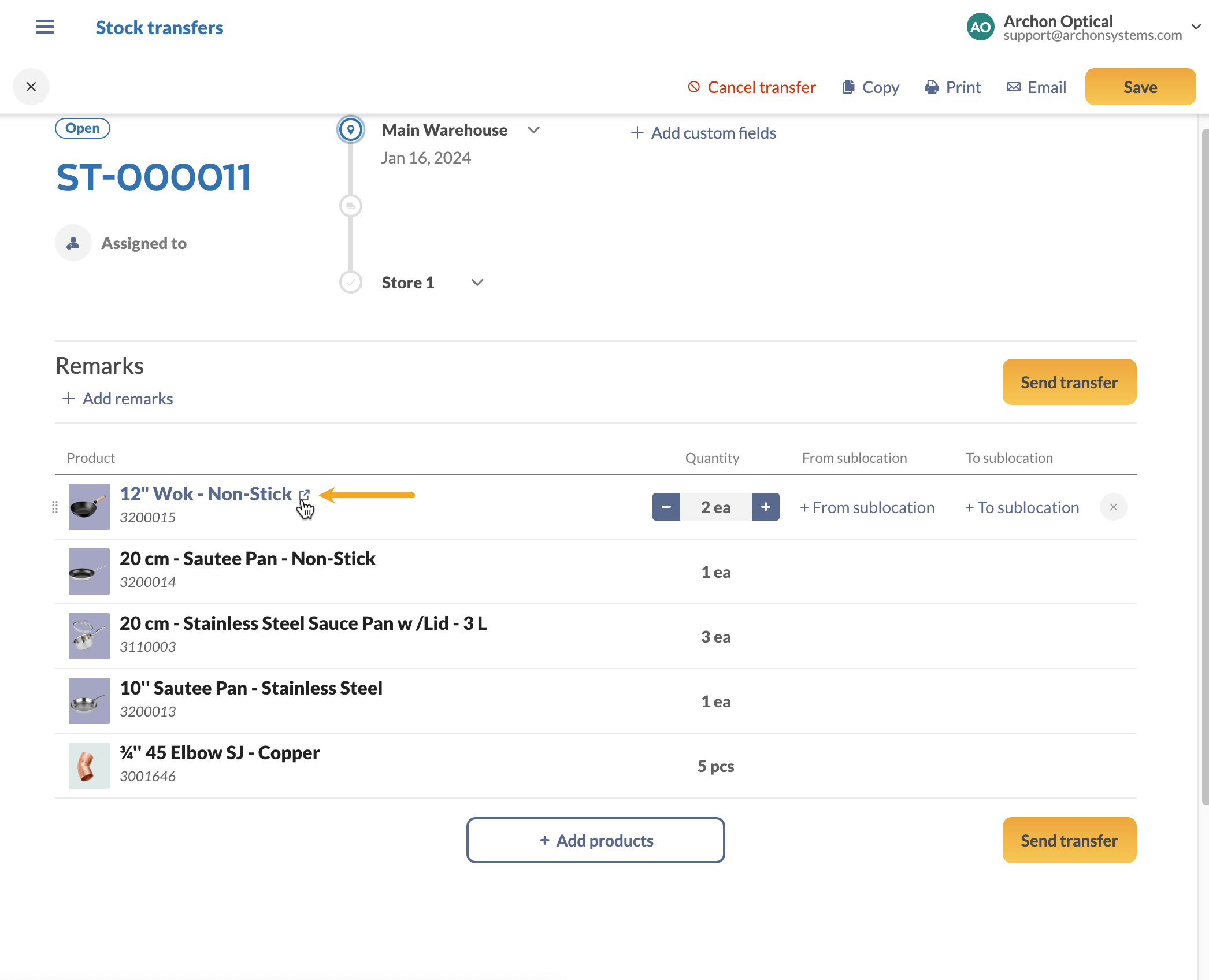 - When you’re done selecting the products, click outside the drop-down menu to continue processing the stock transfer. You can edit the quantity and the sublocations from here.