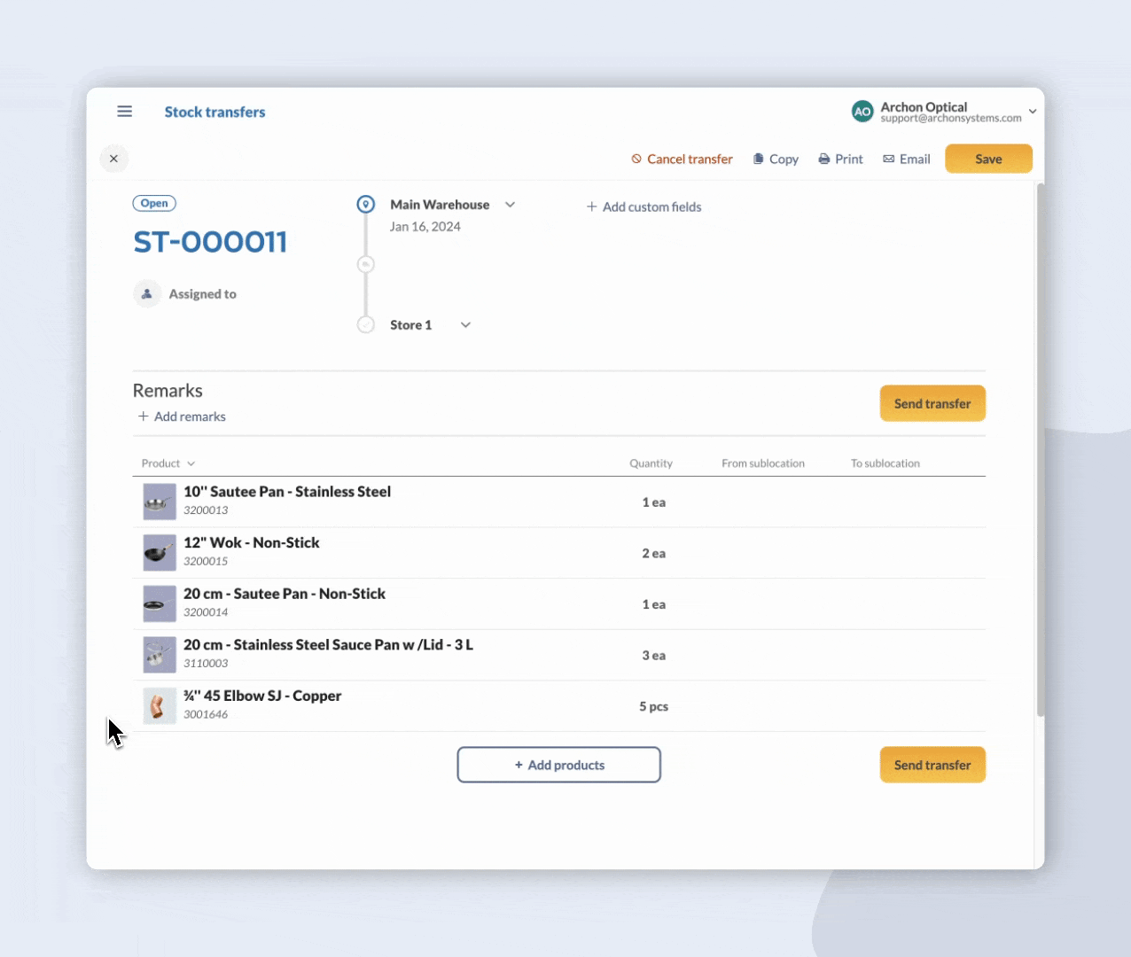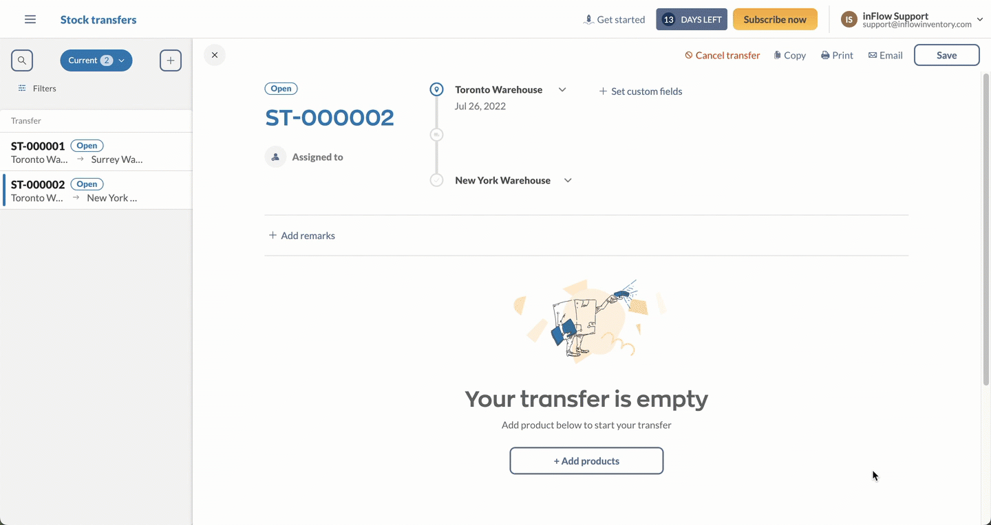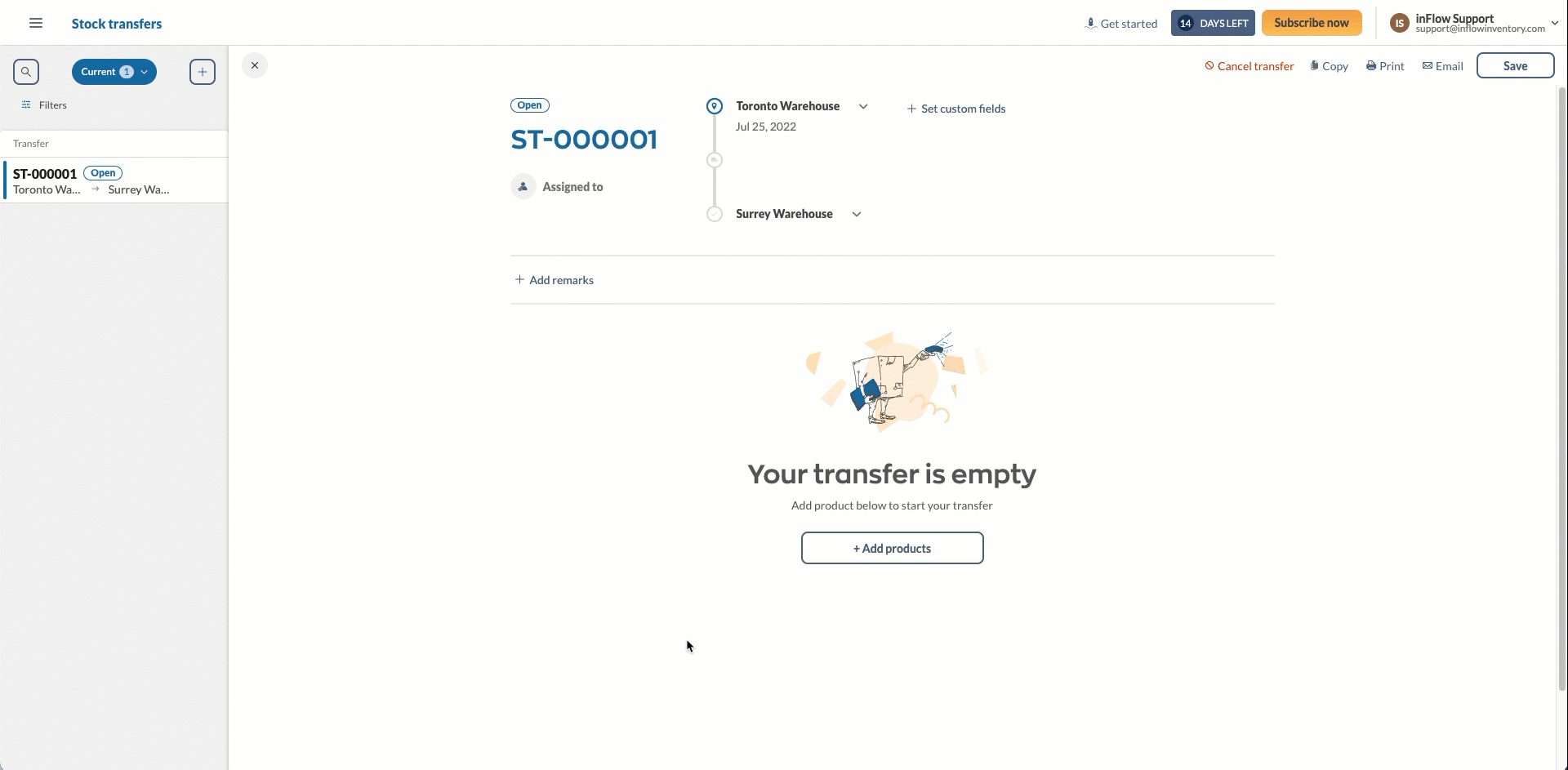 Now that you’ve created a stock transfer, you can add the products that need moving.