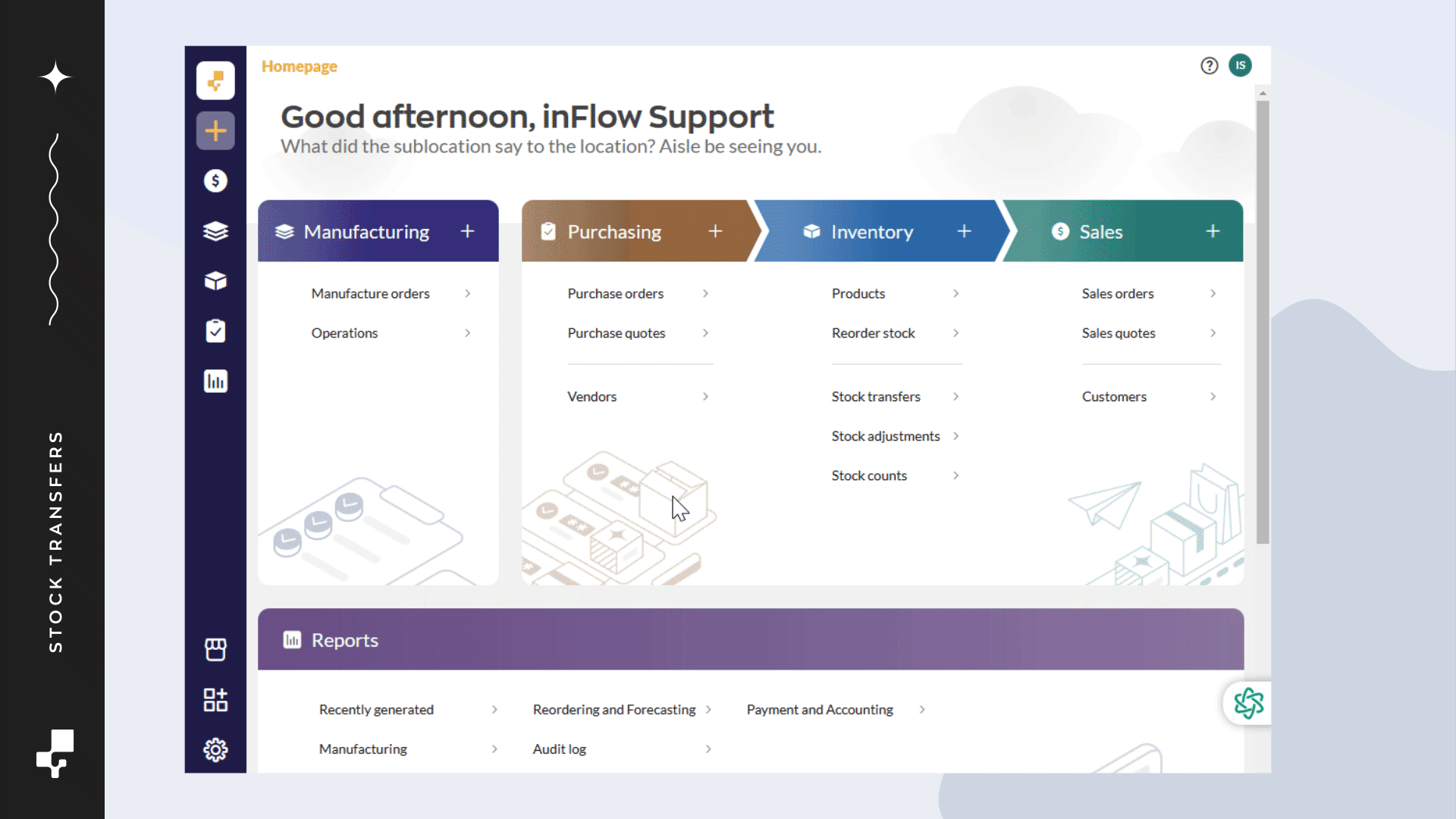 Transferring stock from one location to another is easy in inFlow Inventory! You can also cancel the transfer later on if you make a mistake.