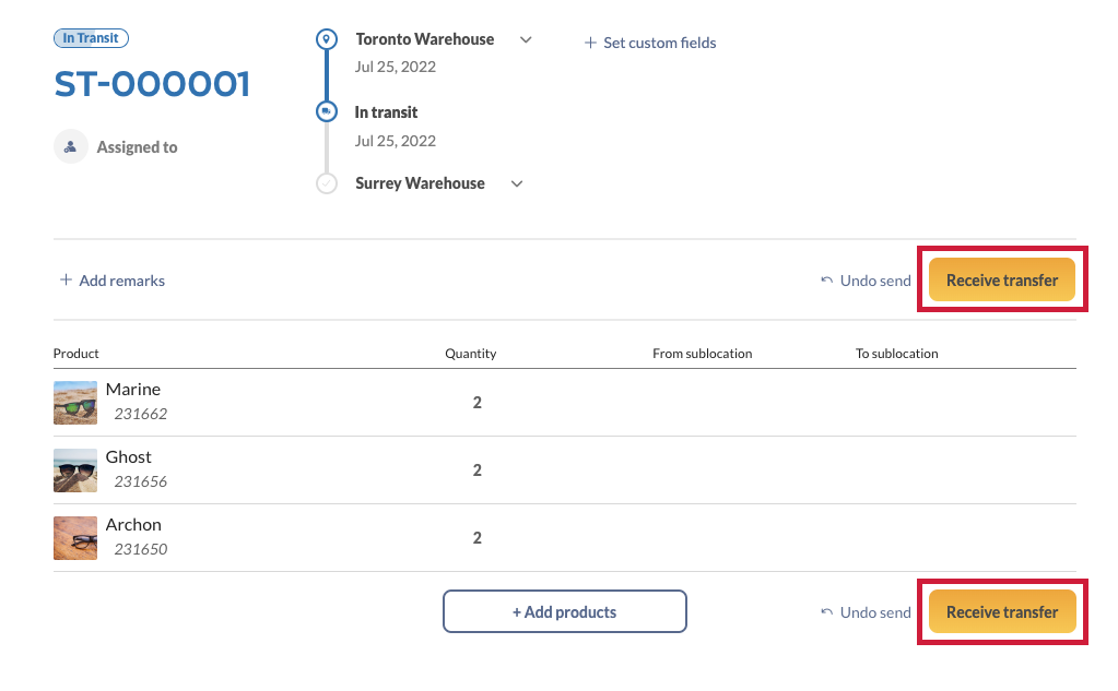 When the products arrive at the destination location, you can open the stock transfer order and click the Receive transfer button. This completes the transaction.