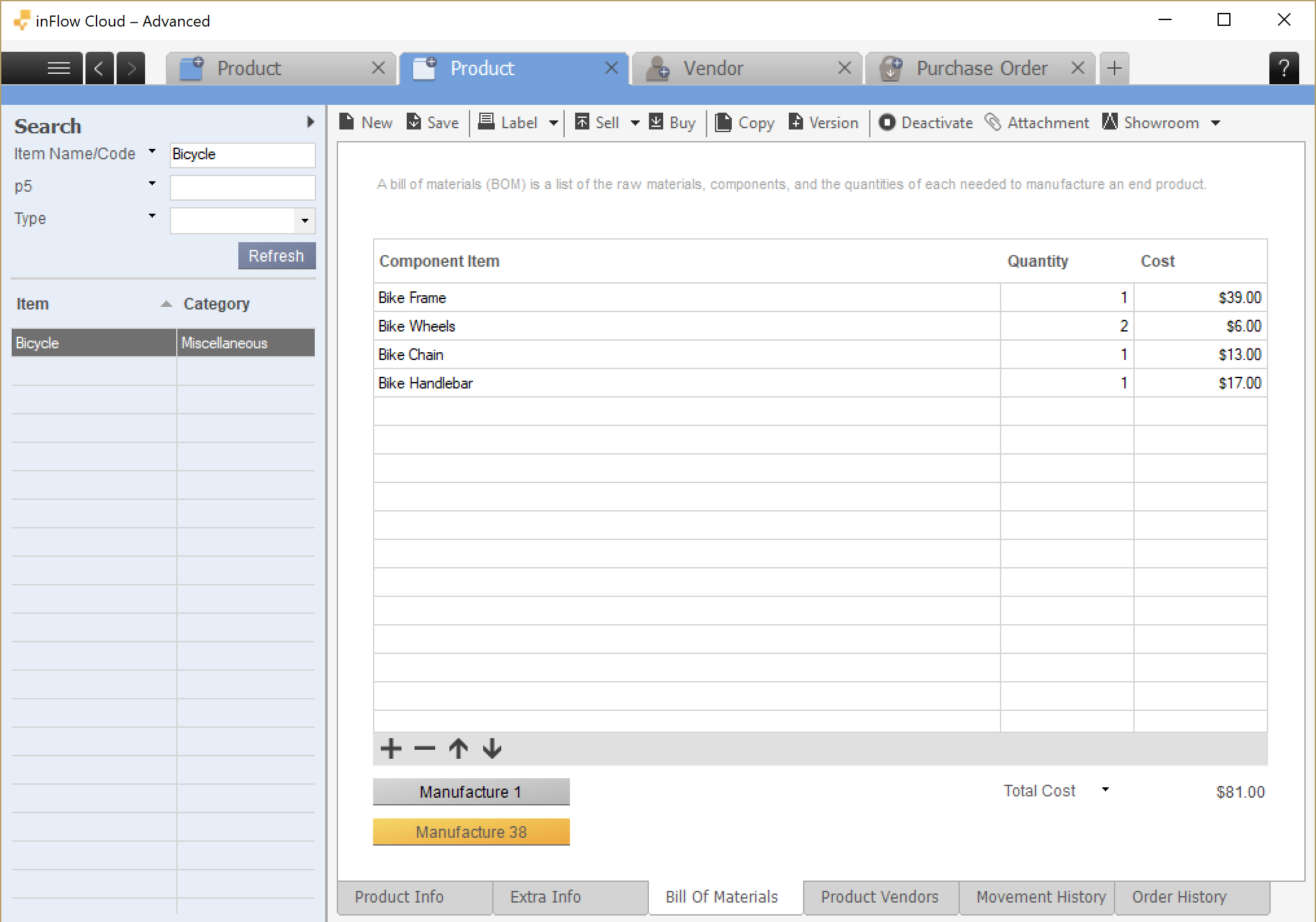 Please note: Bill of materials is only available with an inFlow Manufacturing plan.